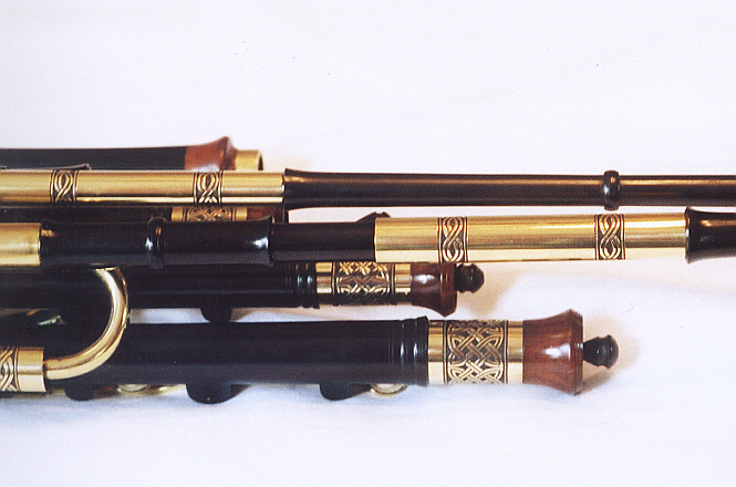 Drone/Regulator Detail, Full Set in Ebony, Rosewood and Brass Hand Engraved by Gil Hocker (Engraving not available as an option on sets)